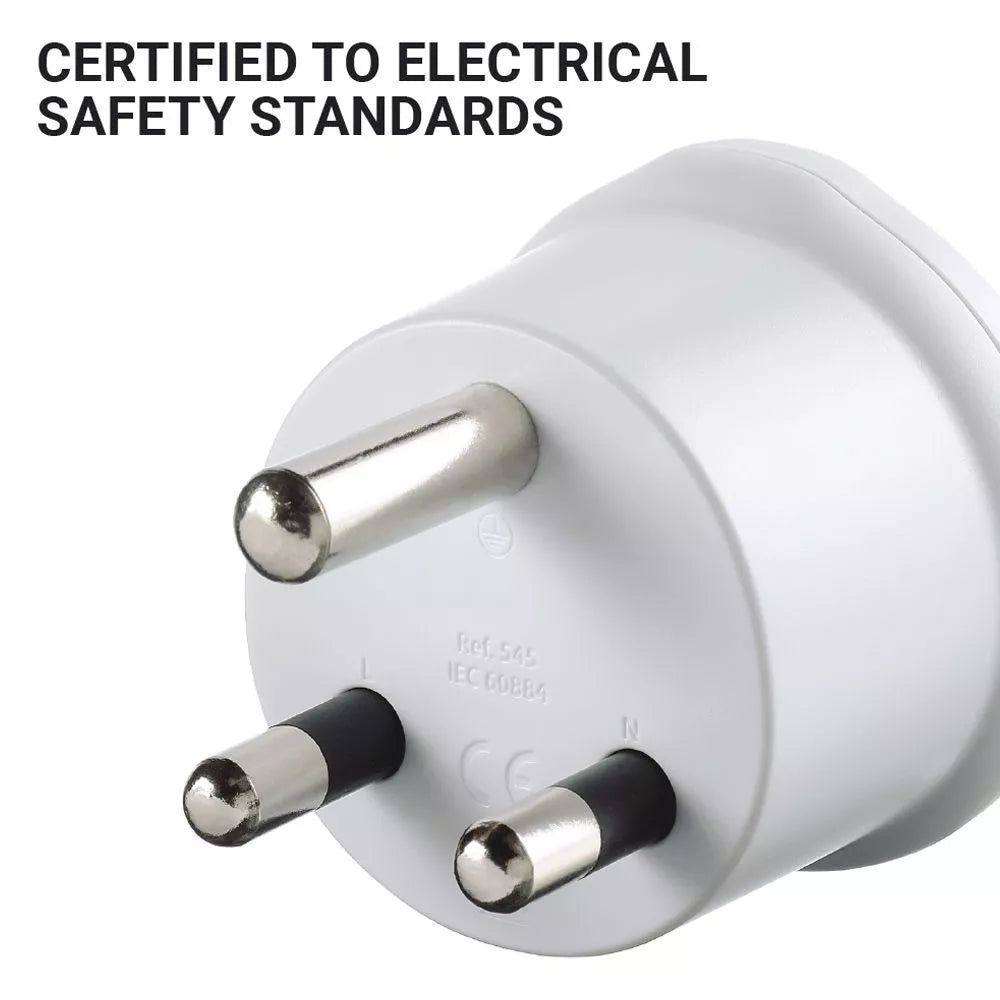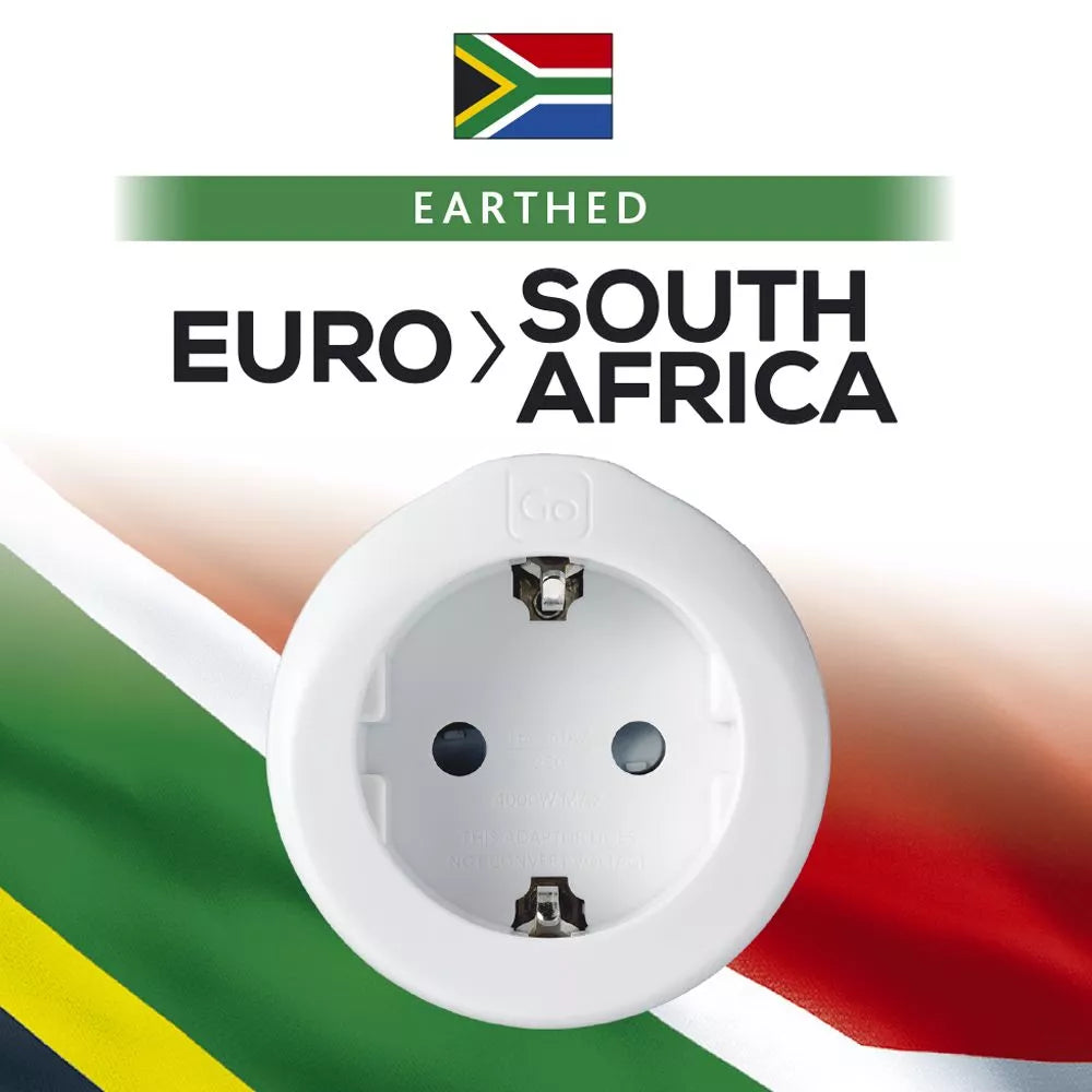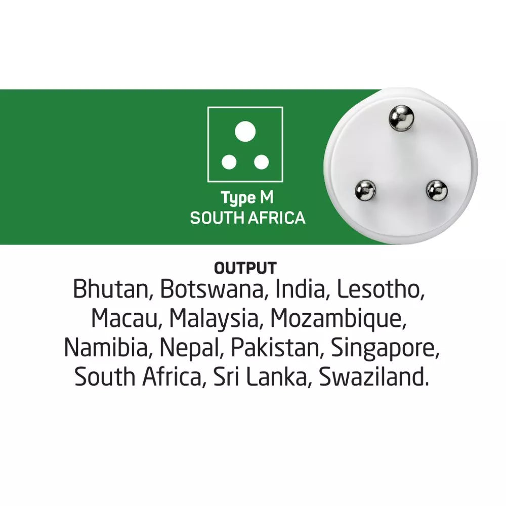- Konverterer fra europeisk type E/F støpsler til jordede stikkontakter type M som finnes i blant annet Sør-Afrika, Namibia, Eswatini og Lesotho