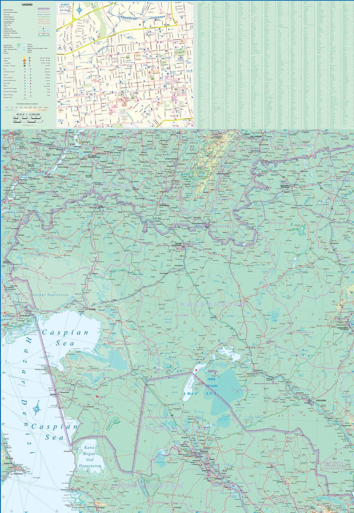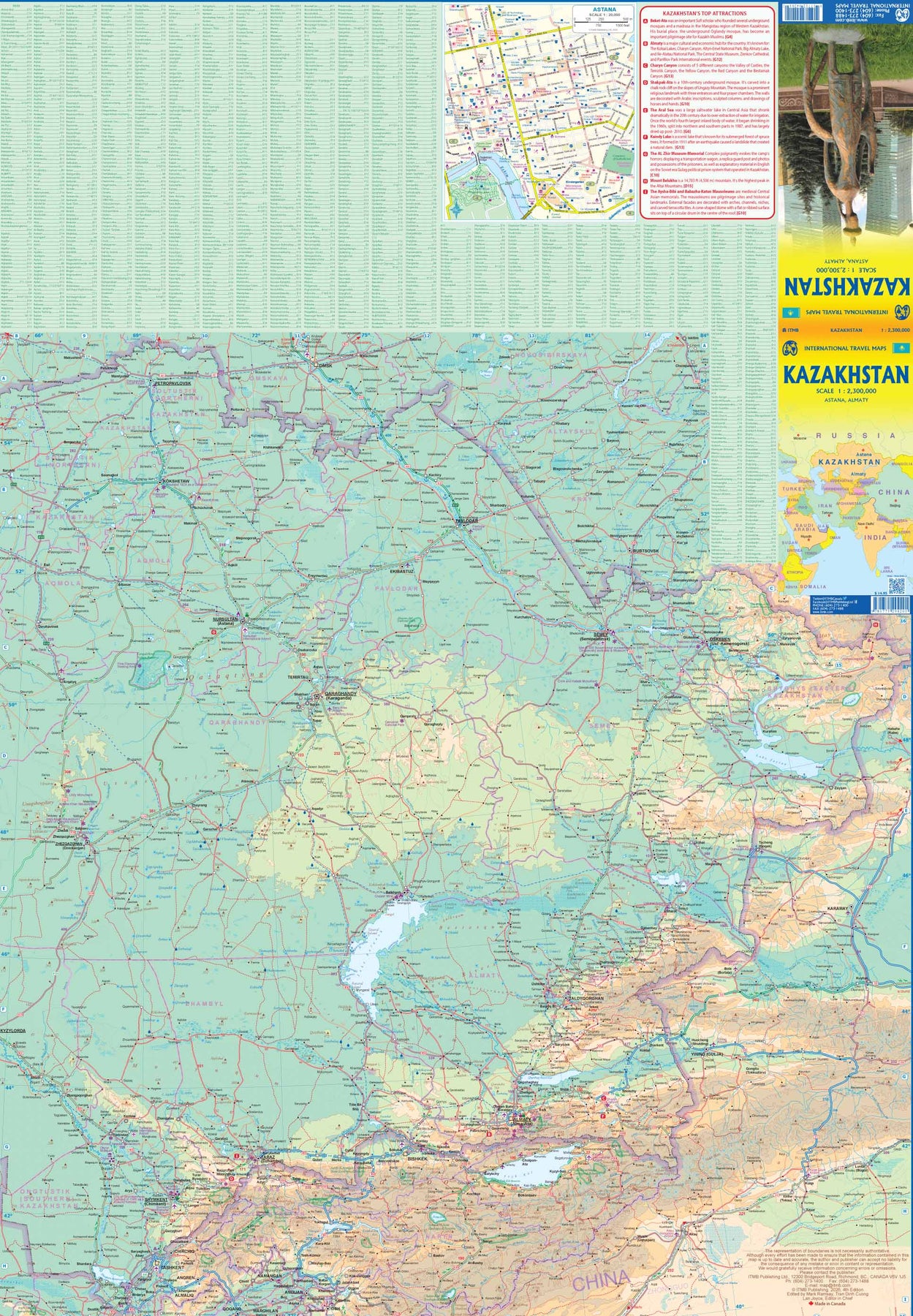 Fra ITM: Kazakhstan is one of the many breakaway countries that split off from the Soviet empire when it spectacularly imploded in 1989/90. It is a very large country, and it shares a long border with Russia Thus far, relations between the two countries seem to be fairly cordial, but Putin is an unstable leader, so the Kazaks have to play a softly-softly foreign policy so as not to arouse the Russian bear. That said, it is a friendly country and well worth visiting. Side one shows the western portion of the country from the Caspian Sea to Zhezqazghan, including the remaining portions of the Aral Sea, which it shares with neighbouring Uzbekistan. This side also includes a very good inset map of Almaty, the capital. The second side covers the eastern portion of the country, including Almaty, which is strategically placed on the ancient Silk Road joining China to Europe and is fairly close to Bishkek, a former trading fortress, now in Uzbekistan.